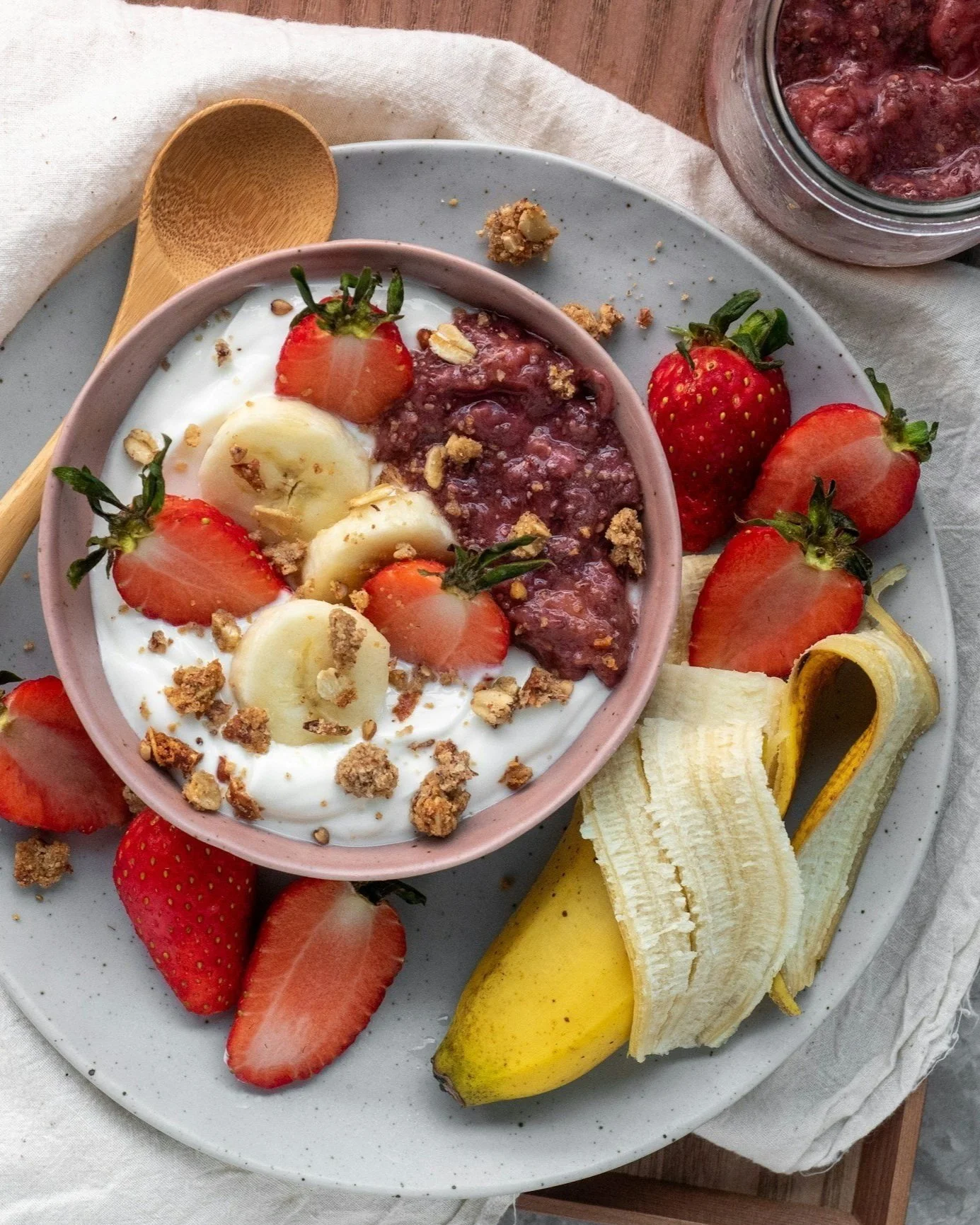 Use about a cup of greek yogurt as your base, then add all of your toppings. Some combos can include peanut butter, banana, and granola; pumpkin seeds, papaya, granola, honey; berries, pecans, maple syrup, and crushed graham crackers.
